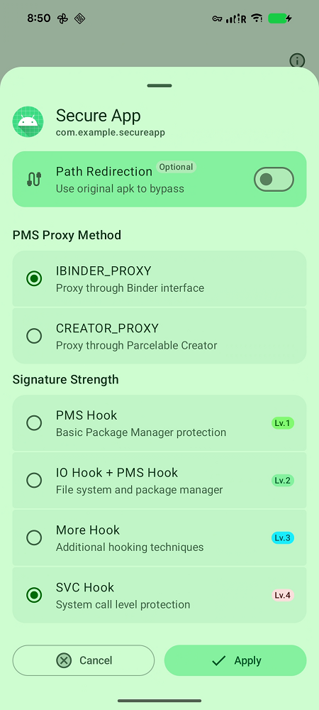 Taking the PMS Hook feature as an example, SRPatch deletes or empties the signature core files within the META-INF directory of the APK, directly compromising the data source for the system's static signature verification. It then hooks the PMS process to modify its execution logic, thereby causing the system to bypass the APK signature validity check.