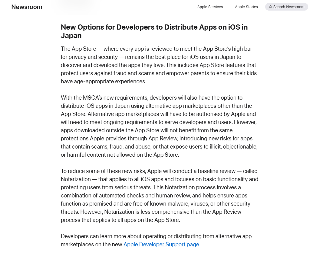 Recently, Apple announced on its official website that to comply with Japan's newly enacted Act on Promotion of Competition in the Market for Specific Smartphones, the Japanese version of the iPhone has officially opened up third-party app stores and app sideloading distribution, while also permitting developers to use third-party payment systems.