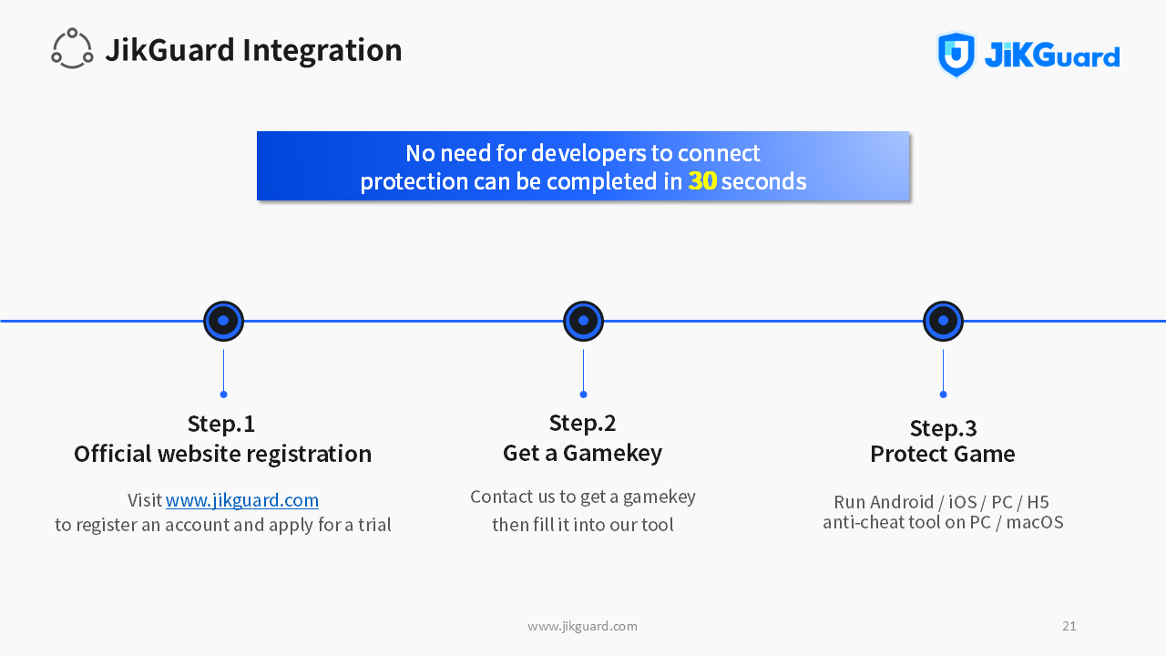 A: JikGuard Game Hardening has specially optimized the integration process, enabling ultra-fast hardening functionality. With just a few simple steps and no developer involvement required, protection can be integrated within 30 seconds regardless of package size, minimizing integration costs.
