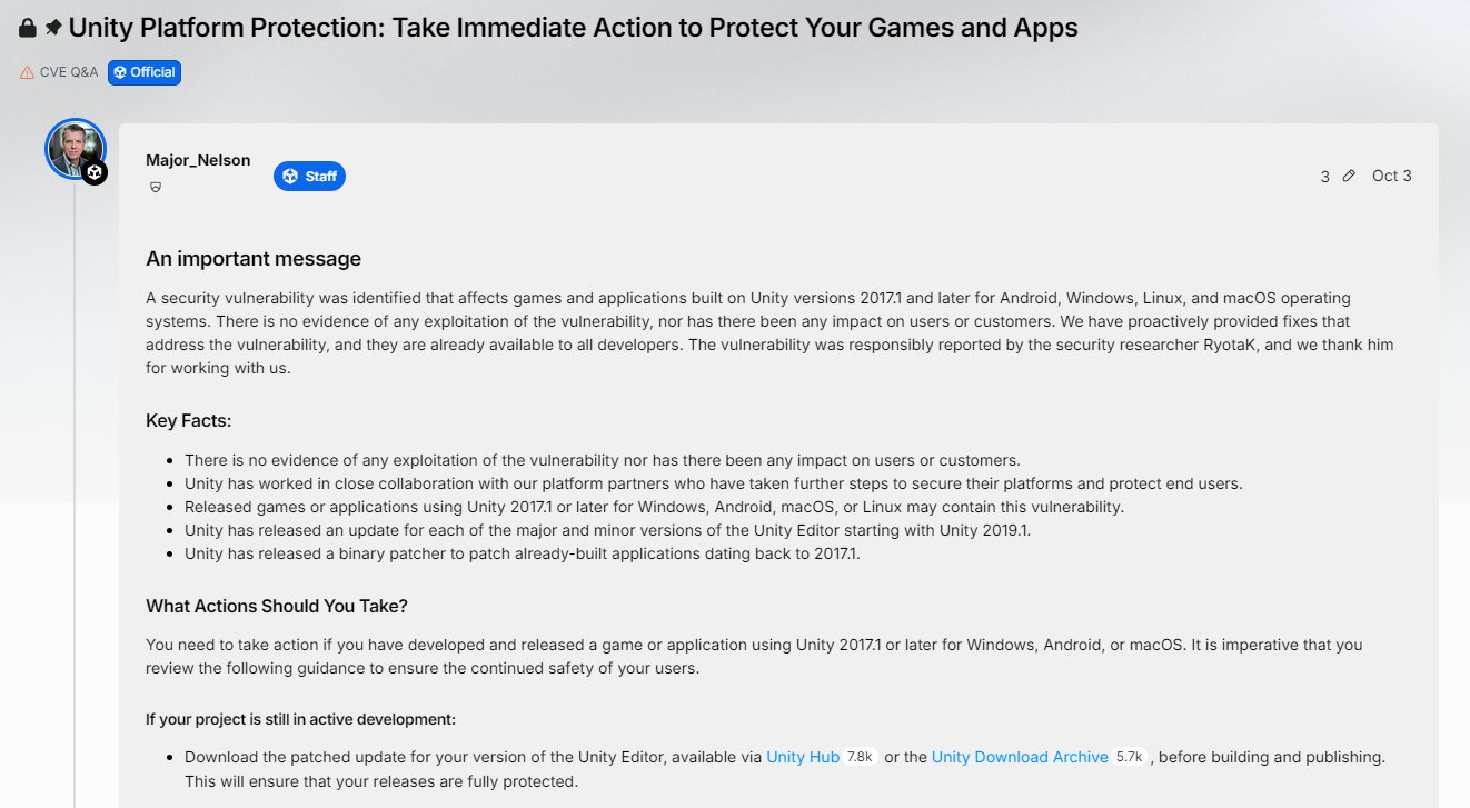 Complete Official Announcement: https://discussions.unity.com/t/unity-platform-protection-take-immediate-action-to-protect-your-games-and-apps/1688031