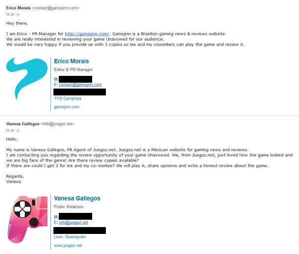 Bonus tip: Pay attention to freelancers! This tip isn't exactly "how to spot a scammer," but as far as getting coverage goes, it’s one of the more important things an indie can do. With all of these scam emails coming in, you may be tempted to ignore anyone who isn’t writing in from a big name site. Don’t make that mistake! When someone reaches out because they want to cover your game, you have an opportunity to build a relationship. This can be especially important with freelancers who might be able to get you coverage in a publication that’s ignored your own PR efforts, or one you didn’t even know existed. And someone who’s freelancing today could be on staff at IGN or Polygon by the time your next game comes out.