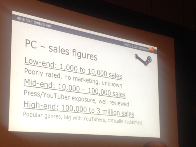 Steam is becoming an increasingly crowded and competitive marketplace, so developers have to consider new avenues to get their games noticed. "If you get big with YouTubers or Twitch streamers, you can get up to 3 million sales," he said. "Probably not likely to happen to you, but you can dream!"