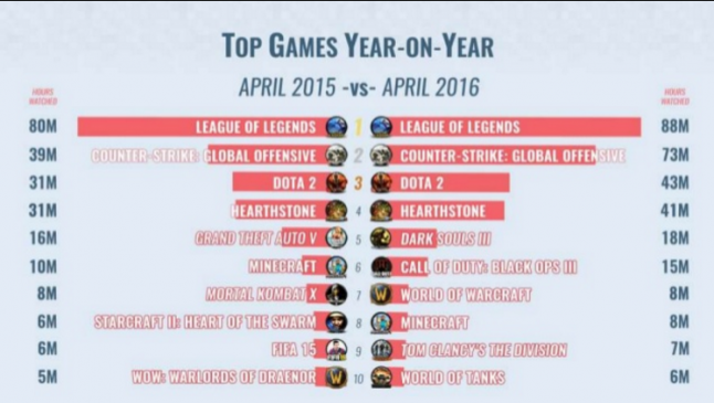 Looking at each game's viewership in terms of hours watched per month, League of Legends' viewing figure grew to 88 million hours watched in April 2016 from 80 million in April 2015. Counter Strike’s viewership also rose to 73 million from 39 million over the same period.