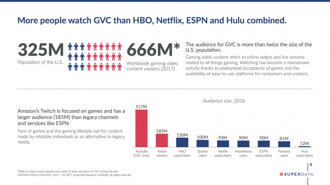 A new report published by the firm says that as many as 666 million people tuned in to watch video game related content online in 2016, totaling more than the combined user base for the entertainment streaming services listed above.