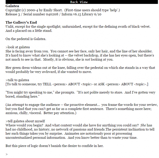 Emily Short’s Galatea is a take on the ancient Greek myth about a sculpture that comes to life. Unlike most IF games, it takes place in a single room and focuses on the player’s interaction with a single character.