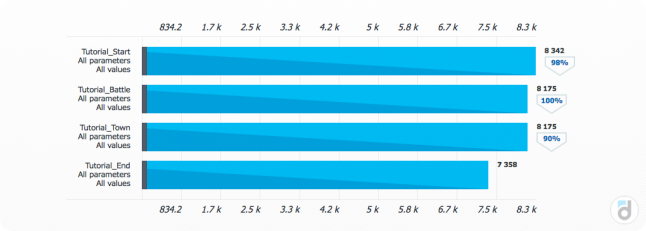 Along with information about the event, you may also pass to the analytical system many more parameters of this event: time of passing the level, the result of the fight, the number of attempts, the amount of virtual currency spent, etc. And then these parameters may be used in any reports, including funnels.