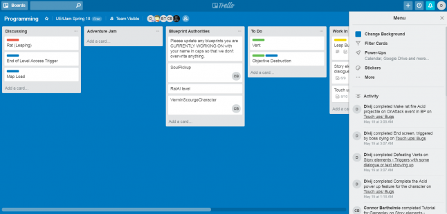 We had separate boards for Programming, Art, Design and Audio on Trello, to keep track of tasks and assign tasks.
