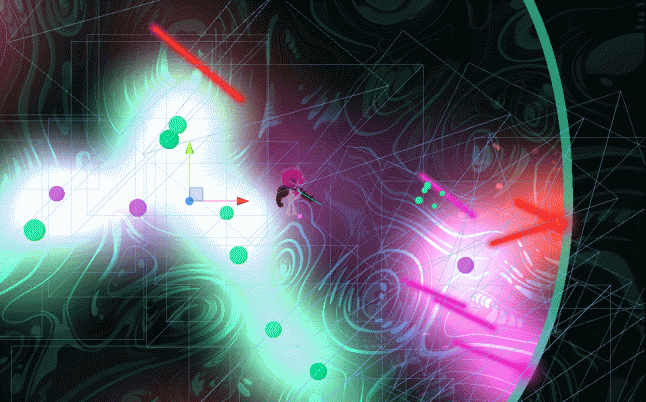Showing and hiding the light mesh. Normally the light mesh is far behind everything else in the game, so it doesn’t show when viewing the scene. Here you can see lasers and some deadly blobs casting off light.