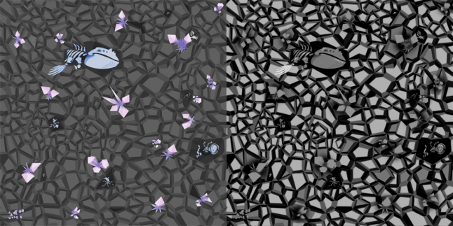 Example of a background texture in Laser Disco Defenders. To the left is the color channels and to the right is the alpha channel used for reflectivity which allows for dark crevices in this cave texture. There’s also a space whale skeleton because... we could!