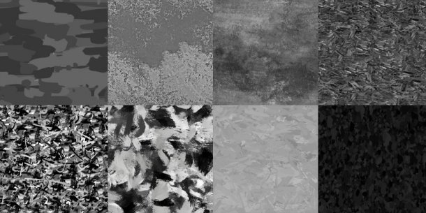Good modelling is essential and a stunning texture won’t save a bad model, but texturing drives a lot of Tölva’s look and helps distinguish it from other games. It’s also what was most clearly imitable from the concepts. We were fortunate enough to be given access to the list of secret brushes that Mr McQue utilises most frequently and to such effect, and using these able to create an automated process that streamlined the texturing of hundreds of assets. We essentially created a system where I fed in my sculpts and a McQuevian texture was churned out for me to tweak and finesse. This worked by taking the right brushes in Photoshop and creating a tiling pattern with each, attempting to recreate a certain type of stroke or scribble that could be found in any given concept piece. With these ‘master strokes’ I could tile relatively convincing McQuvian patterns across a surface, tinting its colour, and using the pattern to break up the edges of masks in Photoshop. Daub, dash, splatter, speckle, spray, smear, squiggle, strokes, crosshatch, and grainy swirl would become my best friends over the next 2 years. Grainy swirl was great for organic or noisy surfaces like mud or concrete, while crosshatch had a natural galvanized metal flakes look. Each pattern came into its own as I built a library of reusable materials from these tiling patterns.