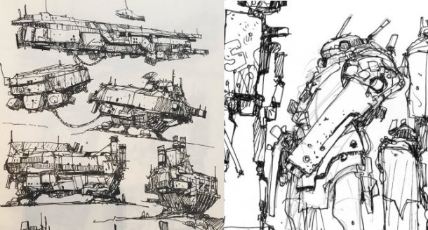 So... Defining the look of Tölva was a process of looking at our inspirations and influences and breaking them down into their constituent parts. This way we could take what made a certain look ‘work’, and begin to create a process that we could apply to a variety of assets while maintaining consistency with one another as well as looking appealing in isolation. This meant taking Ian McQue’s sketches and paintings and finding common shapes, colours, types of brush stroke, silhouettes, and starting to form a "McQuevian language".
