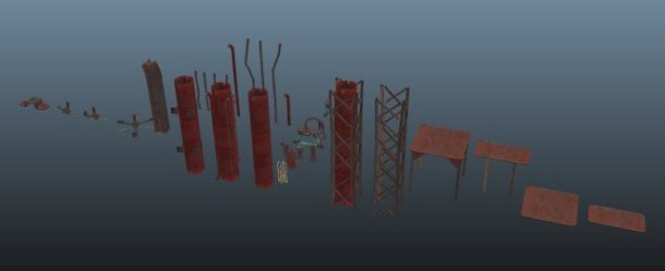 Creating asset kits is a common technique in games utilised particularly well by (for example) the Bethesda teams. Tölva has less of a need for complicated interconnecting architecture but we were still able to get some use out of concrete piece kits that we made to build more industrial areas, and kits of damaged spaceship to decorate the space wreck debris that litters the world. Creating these kits for the environment team (er, Jim) took a sizeable amount of the art dev time. Another example of this kit-based approach are the weapons attachments, all modelled as separate items that could be rearranged and mixed together to create weapon variants.