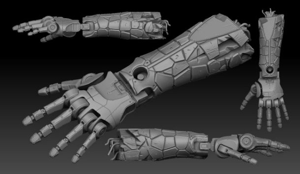 One of the of the recurring aspects of creating such a mechanical world is designing (relatively) convincing joints, paneling, and other robotic goodness. It was important to spend enough time look at machined parts or engines so that I could start to internalise where a cut line might occur, which panels needed screws, how a curved edge might be carved out of a larger piece. Manufacturing is often about starting with a form and reducing it from there, and the same approach works really well when sculpting.