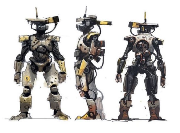 Often robots, vehicles, or ships, were chunky with lots of rectangular protrusions breaking up their silhouettes. Layering of details was important, with colour often going from darker to lighter as the layers got closer to the exterior. Angles were often a few degrees off being parallel with each other but still consisting of straight lines, rarely curved. The dumpier a spaceship, the thinner it’s aerials and wires: <em>contrast from form</em>.