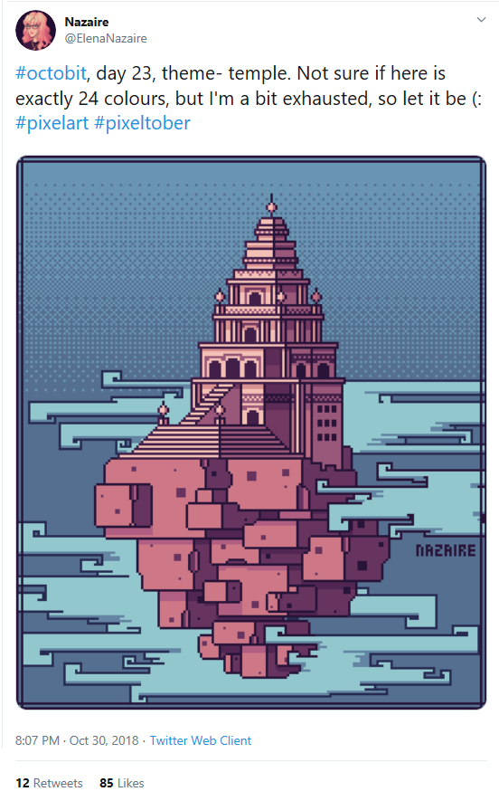 Not all images are drawn equal though. If we try to put them in the game – we need to make sure that we can effectively create the assets of the same style. The temple on the left has distinguishable art style that is reproducible. The tweet with the ruins to the right got way more likes, but it is super-detailed, so it means that we’ll need way more time to draw similarly-styled sprites.