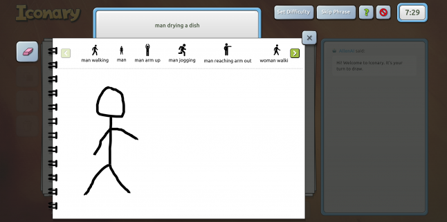Iconary is actually available to try online, and prompts the player with guessing what the AI drew or vice versa. If the player chooses to draw, they're asked to doodle the action provided and then select icons to represent their drawings.