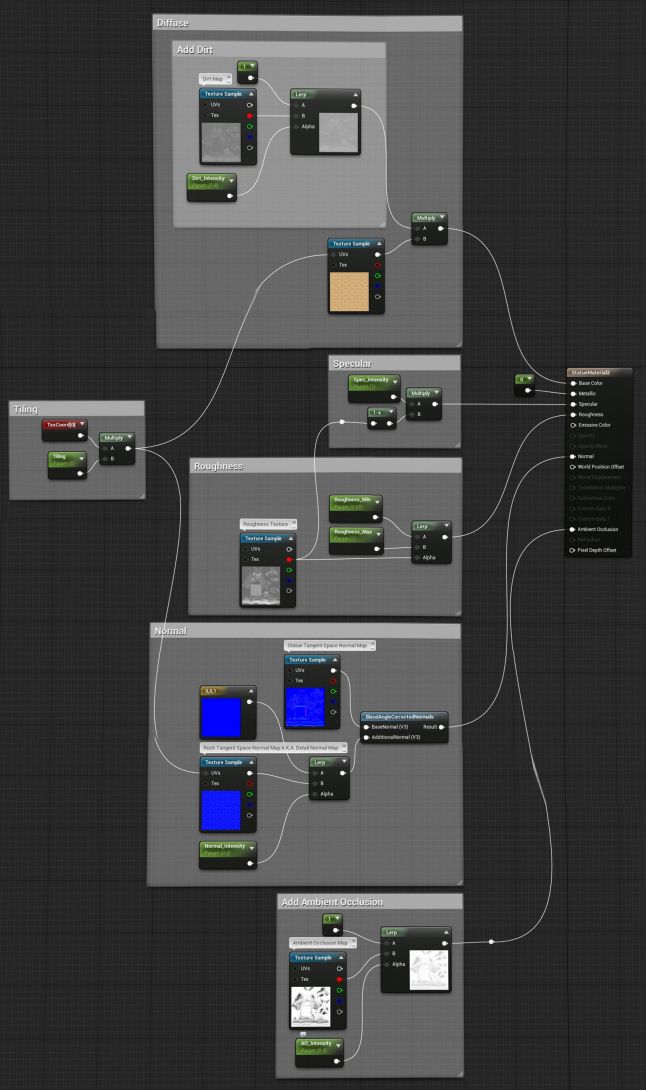 Here’s the material setup in the Material Editor of Unreal Engine 4: