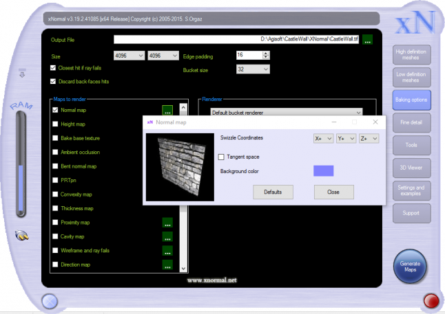 XNormal is a free utility with a pretty straight forward interface, just select your High-Res Mesh and your Based Texture, then Select the Low-Res Mesh, then select your output directory, resolution, and the maps you want to bake, hit that big Generate Maps Button, and you’re done. To bake an object space normal map just uncheck the tangent space checkbox in the Normal Map settings.