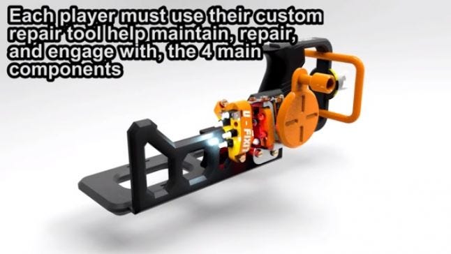 We wanted it to actually work! And it does! The repair tool actually interfaces with the various ports around the 'ship' and allows you to control them or operate them manually. We are using the voltage generated by the controller to receive input from the stations, so the cranking is not just for fun!