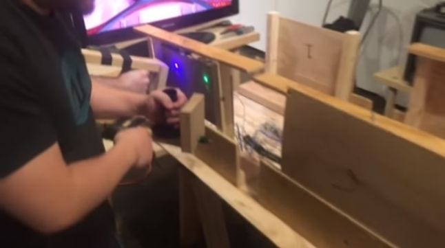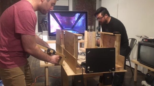 Your spaceship is falling apart in CLUNKER JUNKER, a game where two players have to crank tools to provide power to various parts of their constantly-breaking ship to survive. With four parts that need repairs, limited space for players to move around each other, and having to actually crank the tools to create power, players will be in for a frantic task to keep the ship in one piece.