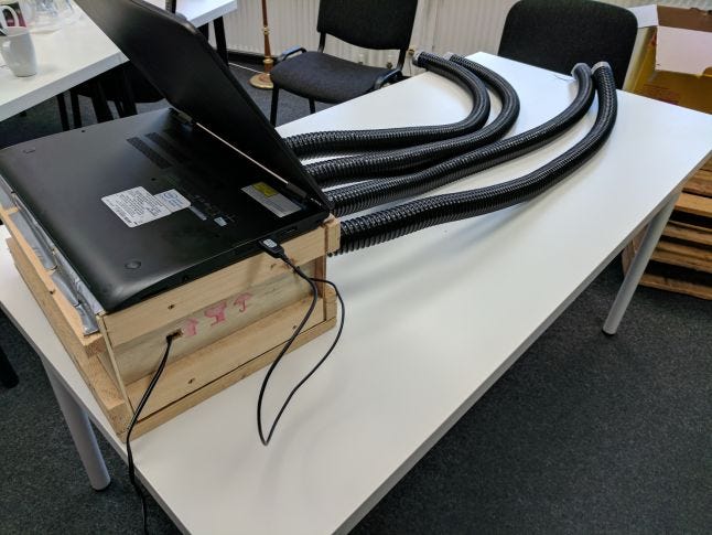The heart of the controller is four hairdryers. Inside the hoses, there are wind sensors that can detect if the hoses are closed. There is an Arduino inside the box that communicates with the computer. I also used a lot of expanding foam to keep everything in place.