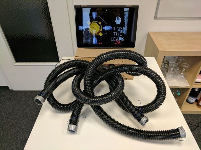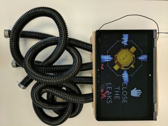 Close the Leaks (to prevent imminent death) accomplishes this by giving air hoses to four players, tasking them with working together to plug or unplug holes with their hands, navigating the ship by letting air out while staying alive by keeping air in.