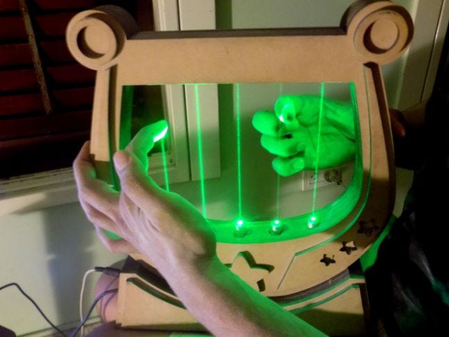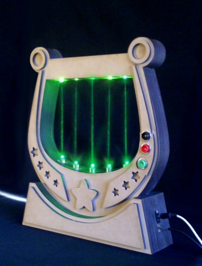 We’ve designed and built an impressive instrument. Inspired by the antique Greek instrument while combining pieces of wooden cuts and emitting green laser strings, the Laser Lyre was born.