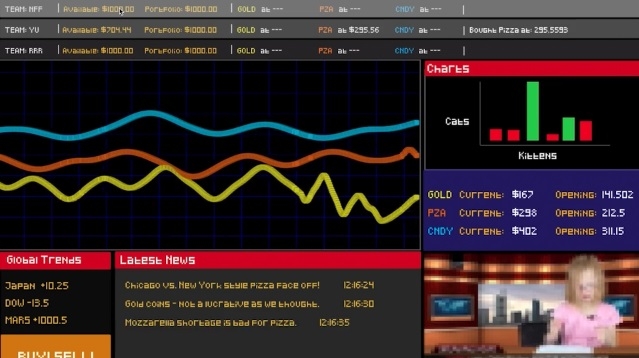 This game is a caricature of stock trading and a gross oversimplification of something that is obviously very complicated. We want the game to feel ridiculously overwhelming, but also highly abstracted and child-like. Instead of deciding to buy or sell the equity of real companies, our players choose to invest in things like candy, gold, or pizza. This emphasizes the allegorical nature of the game and hopefully helps people understand that this is a hypothetical situation standing in for a broader concept.