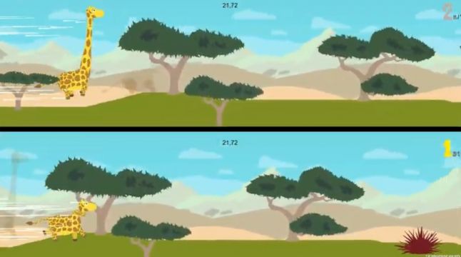 Neck 'n' Neck sees a pair of players stretching and contracting a giraffe's neck to avoid obstacles, racing towards the finish line while riding stuffed animals.