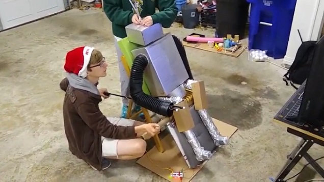 There are two main components to the physical Roambot: the robot, whom I call Romeo, and his chair. Romeo is made primarily of cardboard boxes painted silver, and his arms are one long plastic ducting tube. His claw hands are just some dollar store long-reach grabbers, to which I’ve added metal contacts on the end connected to speaker wire so that closing the claw completes a circuit. The circuit is connected to the PC via a Makey Makey USB module - the claw registers as the use key, and the reclining leg rest registers as the forward key.