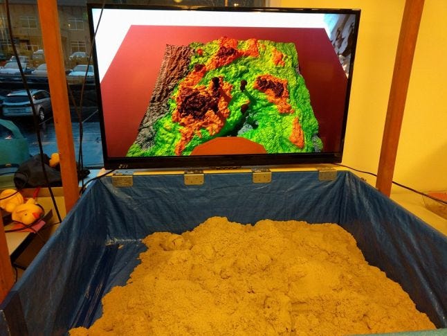 On the tech side, we also use a projector to overlay the world onto the sand, a television to display a 45 degree view of the world with full detail, which isn't as visible in the sand, and the Xbox Kinect V2 to get height data from the sand. It runs fine on pretty much any PC with a mid-range or better GPU and support for 2 display outputs (projector and TV).