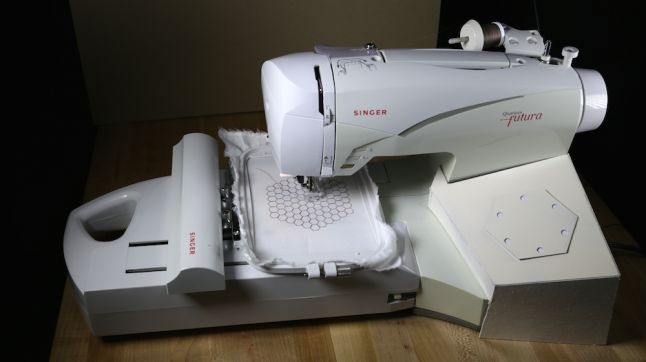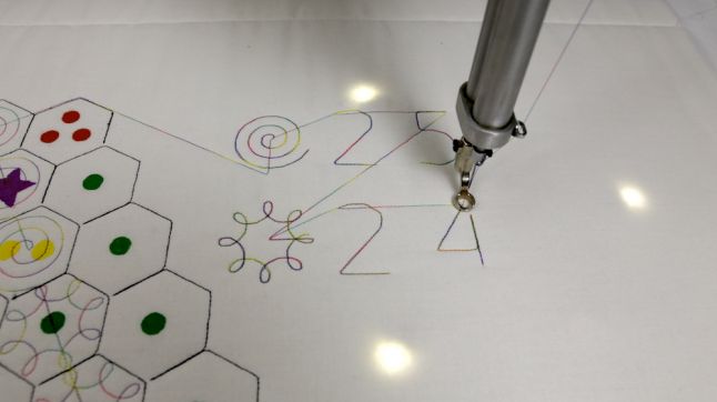 Smith: There are two versions of our game with two different controllers: one is a thirteen foot wide long-arm quilting machine, the other a personal embroidery machine. You can think of both of them as sewing machines that are programmable and can receive instructions from a computer attached to them. The main differences are the size and that for a quilting machine, the needle moves across the fabric and for an embroidery machine, the fabric moves under the needle.