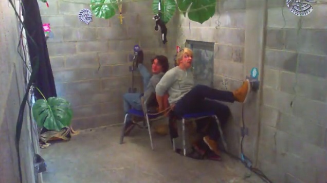 Gosset: In this game, two players are acting as adventurers. They are locked up in a room, and tied up back to back on two chairs. A screen gives them instructions about pushing buttons...