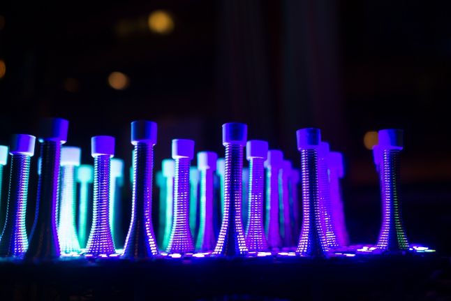 The springs I'm using are just plain door stopper springs that are mounted on a laser-cut board. Inside each spring, I suspend a vibration sensor (which in itself is a spring inside a metal cylinder, closing the contact when you shake it), which is hooked up to a multiplexer. A multiplexer is a little chip that reduces the connections that I need, so I could easily connect hundreds of springs to each Arduino. Finally, there's an individually addressable LED ring around each spring. I'm using Neopixel LEDs, which are the most common type of LED.