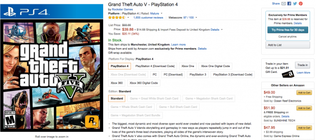 As picked up by VideoGamer, a number of notable releases, such as the PS4 versions of GTA V and FIFA 16, currently can't be purchased directly from Amazon without Prime.