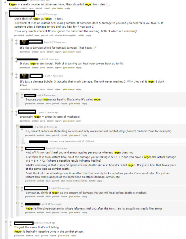 In the document I tear pretty hard into Regeneration. This is a Reddit conversation on how Regeneration in Artifact works. As you can see there are about 5 different mental models on display: it's an instant heal, a shield, like armor, like single-use armor that also heals you so “actually not really like armor”, “negative damage”...