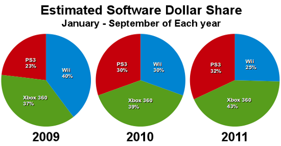 Previously we have been able to provide a platform breakdown of Madden NFL sales, but such information was regrettably unavailable this year. When asked to elaborate on the platform breakdown, Liam Callahan, an analyst for the NPD Group, pointed out that “unit sales of Madden NFL 11 were split fairly evenly across the 360 and PS3 in Aug 2010” and that “when adding the PS2 they favored the Sony consoles.” On the subject of this year's release, he explained that “with the launch of Madden NFL 12 in September 2011, unit sales leaned towards the 360.” That is an interesting shift, and one that highlights just how consistently Microsoft has built its platform and consumer base to sell huge quantities of software. Not only did Xbox 360 owners purchase nearly a million units of Madden NFL 12, but they also found the money to buy 2 million copies of Epic's Gears of War 3. Put a bit more simply, one out of every five units of software sold during September 2011 were either a copy of Madden or a copy of Gears for the Xbox 360. Now add the Xbox 360's share of Dead Island and FIFA 12 sales and it becomes clear just how well Microsoft has executed on its plan to make its platform the dominant platform for HD-class games. (According to Cowen and Company's Creutz, those titles moved nearly 1 million and over 400,000 units, respectively, across all platforms.) The net effect is that Microsoft has started its hot holiday sales streak a month earlier this year than everyone else, to paraphrase a comment made by a colleague about the launch of Halo 3 back in September 2007. Regardless of how one feels about a game like Insomniac's Resistance 3, a PlayStation 3 exclusive which also launched in September of this year, its inability to strike a chord with the PS3 audience is indicative of Sony's failure so far to catch lightning in a bottle this generation the way its main rival has. According to comments that the NPD Group's Anita Frazier made to Eurogamer, Resistance 3 sales came in at around 180,000 units. Based on comments made by analysts, and our own estimations, we have pieced together a picture of what we feel is a reasonable view of the software sales picture on the three main consoles over the past three years. In the following we only consider software revenue during the first nine months of each year. This neglects several factors, including some hit titles whose sales are concentrated during the last two months of each year, and the price differential among Xbox 360, PlayStation 3, and Wii software.