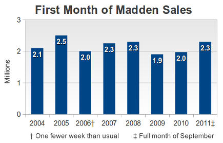 [As part of his monthly NPD Group physical game sales analysis, Gamasutra analyst Matt Matthews looks at how EA's delay of its latest Madden title helped drive a rebound for software sales.] When Electronic Arts pushed the release of its Madden NFL 12 to August 30, 2011, that forced the title out of the NPD Group's August reporting period (four weeks ending August 27) and into the September period (five weeks ending October 1). So in addition to the general lack of new releases in August of this year, the biggest title of the month had its sales recorded for the subsequent month. That led the retail industry to record its worst month of software sales since the beginning of the latest hardware generation, a month of older releases leading sales. By contrast seven of the top 10 titles on the all-formats chart for September were new releases, and Madden NFL 12 led at #1. According to notes from analyst Doug Creutz of Cowen and Company, Madden's total across all platforms came in over 2.3 million units for the 33 days it was on sale during the NPD Group's reporting period. When asked for comment on Madden sales, analyst Michael Pachter of Wedbush Securities noted that purchases during the initial five weeks this year were “just under sales in the first eight weeks last year”. He elaborated that that means during Madden NFL 12's first eight weeks in 2011, EA will see “overall sales [...] up at least 5 - 10% for the comparable first eight weeks” of 2010. In a nutshell, it appears that the late launch didn't affect sales of Madden NFL 12 and EA can expect another year of growth. Because of the differential in release times, a direct comparison to any previous year is difficult, but we provide the following chart of Madden release sales for historical context.