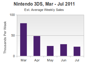 [As part of his monthly analysis of NPD results, Gamasutra analyst Matt Matthews examines how the Nintendo 3DS performed at retail through its last full month at its original $250 price point.] There were only three days left in the NPD Group reporting period when Nintendo announced it would cut the price of the Nintendo 3DS handheld from $250 to $170, effective on 12 August 2011. Consequently, the announcement's effect on July sales was probably negligible and we can look at July sales as entirely the result of the handheld's launch price and software. According to official NPD Group data provided to us, the average selling price (ASP) of the 3DS during the month of July 2011 was $248, confirming that the system was not seeing much in the way of retail discounting through the end of July. Moreover, based on that ASP and the other ASPs for other hardware platforms, comments made by Anita Frazier, and the figures revealed by Microsoft and Nintendo in their respective press releases, we estimate that the Nintendo 3DS sold around 90,000 – 95,000 units during the month. That would mark a 20% decline from June 2011 results, based on average weekly sales, and a 7% decline from the rate in May. The figure below shows the average weekly sales rates for the 3DS since launch. As a result of these figures, the Nintendo 3DS had still not sold a million units in the U.S. by the time Nintendo announced the price cut. (Our estimate puts it somewhere between 915,000 and 940,000 on 30 July 2011.) For comparison, during the first five months of its life, Sony's PlayStation Portable (PSP) sold just over 1.7 million units. The 3DS is now priced the same as the Nintendo DSi XL and only $20 more than the Nintendo DSi, which should make it far more attractive to consumers considering the other Nintendo handhelds. However, price alone won't overcome the lack of 3DS software, and Nintendo knows that. Since the price cut, the company has repeatedly mentioned that a Super Mario 3D Land and Mario Kart 7, both for the 3D handheld, will be available later this year.