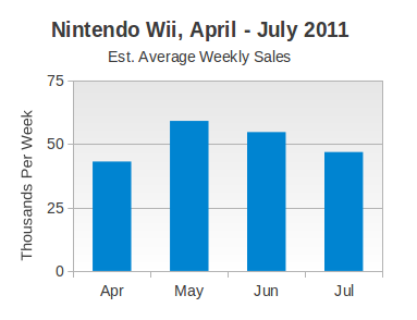 We will see in August's figures, and perhaps more clearly in September's data, just how important that price drop will be, since Nintendo's key new software still won't have arrived. During that period consumers will have a choice of four Nintendo handhelds: the Nintendo DS Lite, the DSi, the DSi XL, and the 3DS. The DS Lite was priced at $100 starting in June 2011, and has been increasingly difficult to find at retailers and online. However, in July the average price of across the three DS models (i.e. not including the 3DS) was $130, according to NPD Group estimates, and that means that a significant number, about 30-40%, of these consumers are opting for the cheapest model. That suggests to us that the surge in sales the Nintendo DS line saw during June and July, from 50,000 units per week in May to over 75,000 units per week, was largely driven by the Nintendo DS Lite price drop. If the DS Lite disappears (and we expect it won't be available much longer) then so will those consumers, and the price of getting a Nintendo handheld will have moved up to $150. As a consequence, Nintendo's current pricing will encourage some potential Nintendo DSi and DSi XL consumers to select the 3DS instead, but that population is limited. When the September numbers arrive in mid-October, we may well be talking about 150,000 – 180,000 units per month for the 3DS. An improvement, surely, but Nintendo certainly wants stronger figures. The market for the Wii is also showing a sharp sensitivity to price, as the effects of the price cut to $150 in mid-May are already appearing to dissipate. Sales shot up to nearly 60,000 units per week during May, but fell back slightly in June and then returned to nearly the same level seen in April, near 45,000 units per week. (See the figure just below.)
