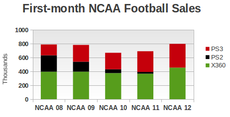 Looking back at 2008 and 2009, one gets a sense of what is missing in 2011: first-party Nintendo games and music games. During July 2008, the top-selling game was NCAA Football 09 on the Xbox 360, but half of the top 10 was dominated by software for Nintendo platforms: Wii Fit, Wii Play, Mario Kart Wii, and Rock Band for the Wii and Guitar Hero: On Tour for the Nintendo DS. (Note that at that time the NPD Group was providing charts that did not combine titles across platforms, as the chart above for July 2011 does. So, for example, if the July 2008 chart were remade in the format used today by the NPD Group, it would combine Rock Band across all platforms and not provide a separate entry for Rock Band for the Wii. In July 2009, NCAA Football 10 for the Xbox 360 wasn't even the top-selling title (again, without combining versions). Rather, Wii Sports Resort ranked first for the month with sales of over 500,000 units. That month six of the top 10 titles were for Nintendo platforms, including Wii Fit, Mario Kart Wii, Mario Kart DS, Pokemon Platinum (DS), and New Super Mario Bros. DS. Other than New Super Mario Bros. DS, which launched more than five years ago in May 2006, not a single Nintendo first-party title broke into the top 10 in July 2011. This isn't to say that Nintendo Wii software isn't selling. In fact, several titles in the top 10 this month are probably there precisely because they sell well on the Wii and the Nintendo DS. That includes licensed titles like Cars 2 and LEGO Pirates of the Caribbean as well as Just Dance 2 -- the current trend in music-based games -- and Zumba Fitness. As we have stated before, we believe that Wii software sales are driven primarily by the enthusiasm of new owners (consumers who have picked up a console within the last six months). We believe this is especially true for Nintendo's first-party titles, and so sales of games like Mario Kart Wii have simply fallen in tandem with Wii hardware sales. The sales of the third-party titles here is possibly the baseline support that the huge installed base of Wii owners can provide, along with some contribution from some new owners. The lack of big new releases in July isn't new, but it did compound the problem this year. Back in 2008 the biggest new title for the month (other than NCAA Football 09) was Soul Calibur IV for the Xbox 360 and PlayStation 3, and combined that title sold fewer than 400,000 units. Other than Wii Sports Resort, no new release made the top 10 in July 2009, and the biggest new release fin July 2010 was Crackdown 2 for the Xbox 360, which sold just over 200,000 units. (If we combine versions as the NPD Group does now, the top new release would have been LEGO Harry Potter: Years 1 -- 4, which sold over 270,000 units combined on the Wii and Nintendo DS. Before moving on, we would like to note at least one bit of good news for EA's NCAA Football franchise. With the end of the PlayStation 2 and PSP as a key platforms, the seminal college football title has moved to just the PlayStation 3 and Xbox 360. (We'll decline to opine upon the aborted All-Play experiment for the Wii.) Despite consolidation on two platforms, NCAA Football 2012 has shown 15% growth in sales over last year. The figure below shows historical data for NCAA Football on the three main platforms.