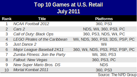 [As part of his monthly analysis of NPD results, Gamasutra analyst Matt Matthews explains what July 2011 was missing: first party Nintendo games and music titles.] With the right mix of software releases, July could have been a month of growth for the packaged video game industry. However, a dearth of new releases and the collapse of titles from previous months drove July to a mere $336.2 million in revenue, a drop of nearly 17% from the $403.3 million figure for July 2010. During the last historical peak in video game sales three years ago, the industry experienced its best July showing ever, with software sales of $592.2 million in July 2008. The results of July 2011 represent 43% decline -- or over a quarter of a billion dollars -- in software revenue from that record. Looking back at the available sales charts for earlier in 2011 as well as July in the years 2008, 2009, and 2010 provides some helpful context for understanding what happened in July of this year. First, at least three titles which had been key to sales this summer did not perform well last month. Sony's PS3-exclusive InFamous 2, which had launched as the third best-selling game in June and sales of over 350,000 units, did not make the top 10 chart at all for July. Moreover, L.A. Noire and Duke Nukem Forever, the #1 and #2 games in June, respectively, also dropped out of the top 10 in July. According to Anita Frazier, analyst for the NPD Group, only eight games had sales of 100,000 units or more in July 2011. In this case, Frazier is speaking of sales after combining all versions of a game across all platforms (as shown on the chart below), so the aforementioned titles which fell off the top 10 chart each had sales of less than 100,000 units. Even accounting for the difference in the number of weeks (June is a 5-week month for NPD Group data, while July has only four weeks), that means the decline in sales of those key games was significant.