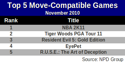 [As part of his monthly look at NPD results, Gamasutra analyst Matt Matthews looks at a bleak November in U.S. retail for Sony, offering a fascinating comparison of its Move strategy versus Microsoft's for Kinect..] Except for the record-setting launch of Call of Duty: Black Ops for the PlayStation 3, there were few reasons to cheer Sony's fortunes in November's U.S. game retail figures. Of its three platforms – PlayStation 2, PlayStation 3, and PlayStation Portable – only the PlayStation 3 isn't moribund. The PlayStation 3 enjoyed a good run after the PS3 Slim was launched at $300 at the end of August 2009, but as soon as the year-over-year comparisons started coming due in September, the system's sales figures have looked anemic. Clearly the understated launch of Sony's new Move controller has not significantly moved the needle on hardware or software sales. While the hardware bundles were modestly popular in October (when 1/3 of PS3 hardware systems were Move bundles), that popularity has waned through November with the fraction of Move bundles falling to 1/5. According to Wedbush's Pachter, PS3 titles with “Move” in the title have sold fewer than 200,000 units collectively. (That doesn't count games that have been retrofitted for Move compatibility.) The NPD Group provided an exclusive software listing to us, one which shows the top-selling Move-compatible games in November 2011. That table is below.