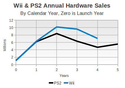 Yet, as you can see above, the PS2 rebounded to 5.5 million systems in its fifth year. Whether we can expect the same of the Wii in 2011 is unclear. If one takes the position that software drives hardware (and it does, in some instances) then 2011 does not appear to be the same kind of year that 2005 was for the PS2. Remember that many classic PS2 titles were released in 2005, including Devil May Cry 3, God of War, Gran Turismo 4, Resident Evil 4, and many others. Just in terms of raw sales, the PS2 dominated sports games that same year with Madden NFL 06 moving nearly 3 million units, NCAA Football 06 over a million, MVP Baseball 2005 just under a million, and NBA Live 06 just over 800,000. The all-format top 10 chart for 2005 also included the PS2 versions of Star Wars: Battlefront II (over a million units) and Star Wars Episode III: Revenge of the Sith (just over 900,000 units). This is a key distinction between the PS2 and the Wii. The PS2 saw its annual software sales curve peak two years after its peak hardware sales, appearing to show that consumers continued to purchase software long after they obtained a system. By comparison, Wii software has roughly tracked with its hardware sales, and that suggests that new system owners are the primary engine of Wii software sales. The figure below shows annual software sales for the PS2 and Wii on the same time scale as the hardware graph just above. Note how Wii hardware and software peaked together in 2008 and 2009 (years 2 and 3 on the graph) and then fell together the following year. However, PS2 software grew in 2003 and 2004 (again, years 2 and 3 on the graph) while the system's hardware sales fell.