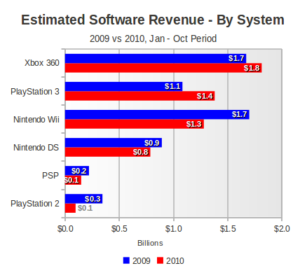 [As part of his monthly analysis of NPD numbers, Gamasutra analyst Matt Matthews contextualizes October's modest U.S. game software retail revenue growth in the face of a larger, much more complex picture for video game software year to date, including platform leaders and a startling annual five-fold decline for the music genre.] While there was a modest 6% year-over-year increase in software revenue for October 2010, total software revenue so far in 2010 is still down 7%, or $400 million. To understand what's going on beneath the surface, we've broken out software revenue in a variety of ways. For example, one could consider the question of how much the year-to-date revenue on each system has changed. There are currently six active systems on the market: Sony's PlayStation 2 and 3 and Portable, Nintendo's Wii and DS, and Microsoft's Xbox 360. Considering the month-to-month (relative) changes in revenue for each system reported by analysts and comments by Microsoft and Sony about revenue for their respective platforms, we have pieced together estimates for each of these six systems. The figure below breaks out YTD software revenue from 2009 and 2010 by platform. The systems are ranked from top to bottom by YTD software revenue in 2010. (Note that this figure shows only the January to October period for both 2009 and 2010. Even though full-year figures are available for 2009, we're making a comparison between the same period in both years.)