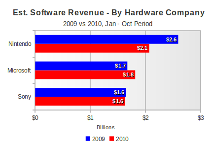 Starting at the bottom, the venerable PlayStation 2 has seen its YTD software revenue drop by 70%, which is not that unexpected for a system which just completed ten years in the U.S. market. The PSP, which has been on the market for over five and a half years, also saw a dramatic decline (over 30%) in its software revenue so far this year. Its slower fall has put it ahead of the PS2 in terms of revenue this year, but it still accounts for less than 3% of the software market, by our estimates. Software revenue on Nintendo's DS platform, which this month begins its seventh year on the market, dropped by a somewhat more modest 12% from 2009 to 2010. Still, it accounts for nearly 1 in ever 7 software dollars spent so far this year. The top three software revenue generators are the current-generation consoles, and here is where things get interesting. In October 2009, the Wii had generated the most software revenue of any single system on the market, just slightly ahead of the Xbox 360. However, at this point in 2010 it is third, behind the PlayStation 3. In contrast, the Xbox 360 has nudged its revenue up over 8%, helped in great part by sales of Halo: Reach in September and October. The PlayStation 3 has done even better, relatively speaking, with software revenue going up by over 25%. These figure are even more striking when one considers the installed hardware bases. The Nintendo Wii has passed the 30.5 million system mark, or over 2.2 times the size of the PS3 installed base of 13.7 million systems. With that kind of advantage, it is notable that the PS3 has moved approximately $100 million more software this year than has the Wii. Simply put, the average PS3 owner is spending significantly more money on software than is the average Wii owner. Note, however, that this does not mean that the PS3 is selling more unit of software – just that it is generating more revenue. Due to the differential in average software prices for each of the platforms, the Wii undoubted has moved more units of software in 2010, but more money has been spent on PS3 software. To sum up our first look at software revenue: The three oldest systems on the market along with the Wii are all seeing declines in software revenue (down 27% or about $840 million), while the Xbox 360 and PS3 are showing increases (up 16% or about $440 million). If we group platforms by manufacturer, we get another view of software revenue, shown below.
