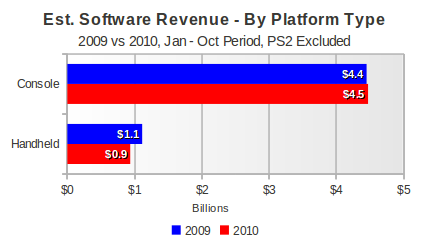 Since Microsoft has only the one platform, the Xbox 360, the story we see here is the same: over $100 million in software revenue growth. For Sony, the so-called PlayStation family of systems has realized a small, approximately $20 million, decline in software revenue. The company has at last generated enough demand with its flagship console to overcome almost all of the software losses its is experiencing on the PS2 and PSP. However, these systems appear to be on terminal trajectories, and if their revenues effectively go to zero in 2011 then the question becomes whether the PS3 can fill that gap – about $450 million – in Sony's revenue stream. The larger story in the figure above, however, is the $500 million contraction in software revenue on Nintendo's platforms. Industry-wide, retail video game software revenue has fallen only $400 million, and Nintendo's systems have contributed all of that loss and more. If it weren't for strong Xbox 360 software revenue this year, the industry's hole would be even deeper. One last view of all software, just to show how the current decline has many faces. Below we pulled out the PlayStation 2 revenue, since it is both small and an anomaly in the current market. Then we considered consoles (Xbox 360, PS3, and Wii) versus handhelds (PSP and NDS).