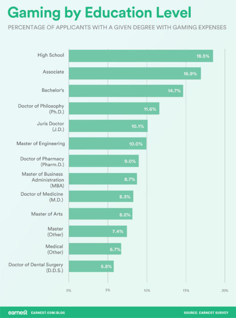 Similarly, Earnest found that both younger people and applicants with less-advanced degrees were more likely to spend money on video games than older individuals or those with Masters or Doctoral degrees. But even looking at spending based on individual degrees has some interesting information to show.
