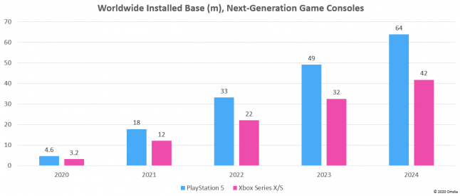 As the graph below shows, Omdia expects the PS5 to build on the momentum from the previous console generation by taking a small lead in terms of console installs in 2020. After that, the PS5 begins to pull away from the Series X and S as the years roll by, creating a substantial gap of around 22 million consoles by 2024.