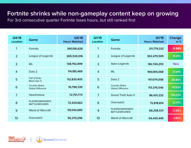 Fortnite, meanwhile, has seen a slight decline from StreamElements' last quarterly report, but has remained stable compared to Apex Legends' recent arc. Between Q4 2018 and this Q1 2019 report, StreamElements data says that Fortnite's viewership hours fell by around 8 percent.